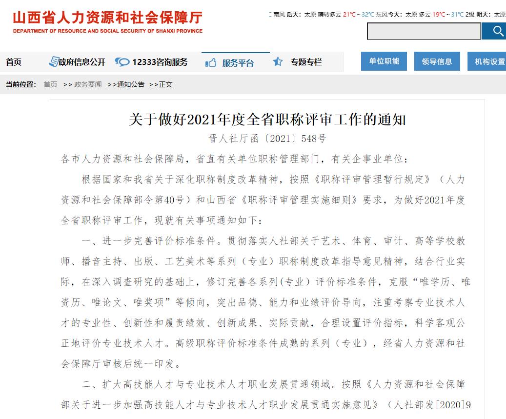 關(guān)于做好2021年度全省職稱評(píng)審工作的通知 晉人社廳函〔2021〕548號(hào)
